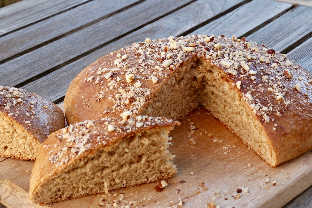 Laissez refroidir puis badigeonnez la brioche de sirop d’agave avec un pinceau alimentaire et saupoudrez-la de noisettes mixées grossièrement.