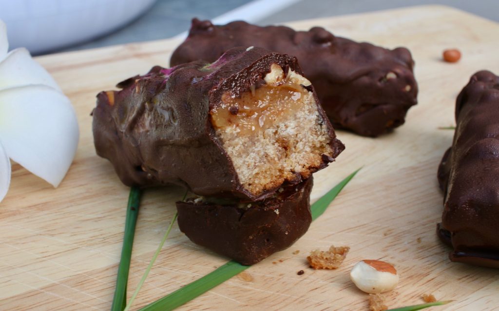 Faites fondre le chocolat pâtissier au micro-ondes ou au bain-marie puis ajoutez l huile de coco. À l aide d une cuiller à café, badigeonnez chaque snicker de chocolat puis entreposez au congélateur pour faire durcir le chocolat. Resortez les snickers pour badigeonner également le dessous.