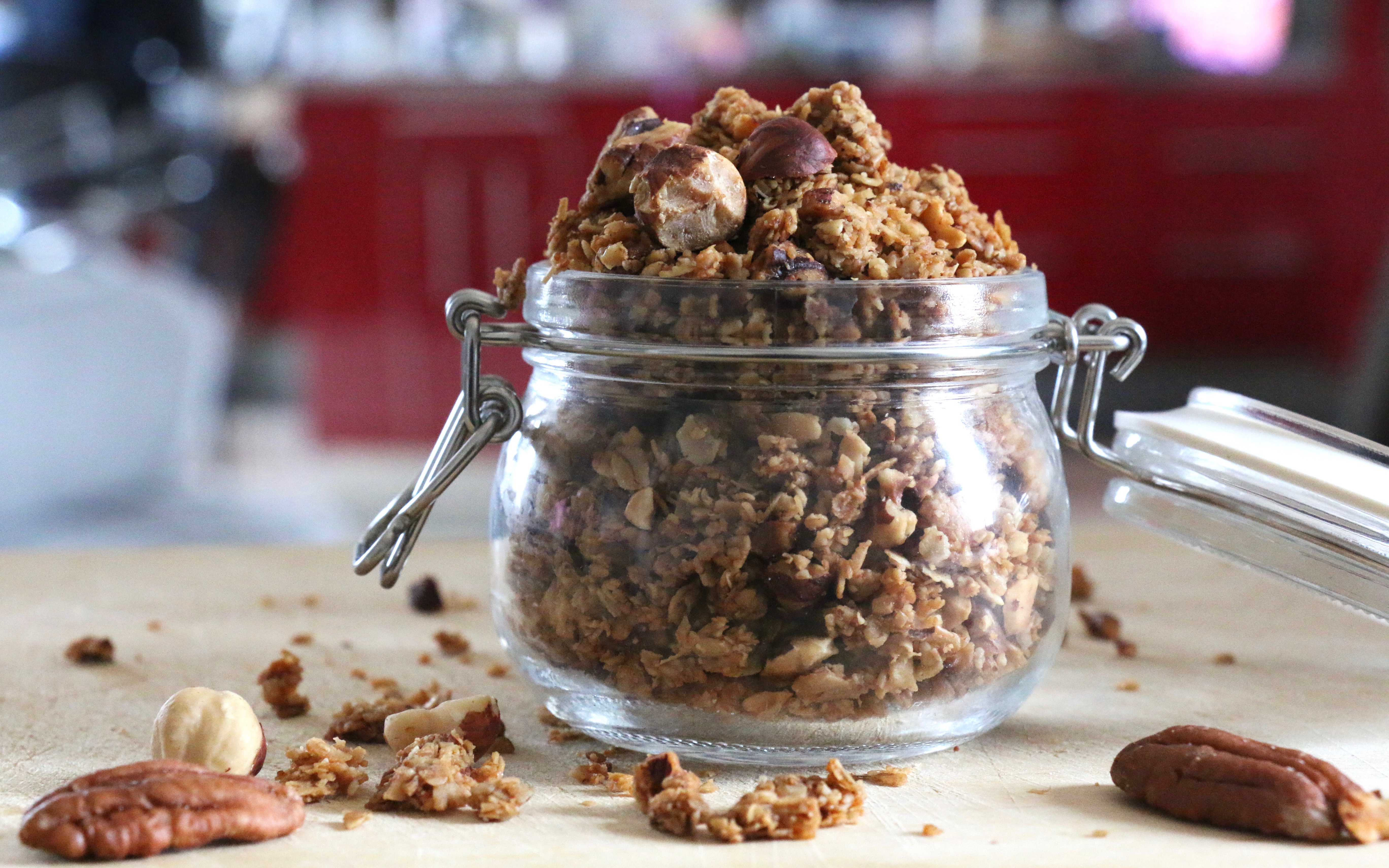 Variante : remplacez les noix de pécan par des noisettes, des pistaches ou des amandes. NB : l’IG des flocons d’avoine grimpe à la cuisson mais redescend en refroidissant, cette recette reste donc « IG bas ».