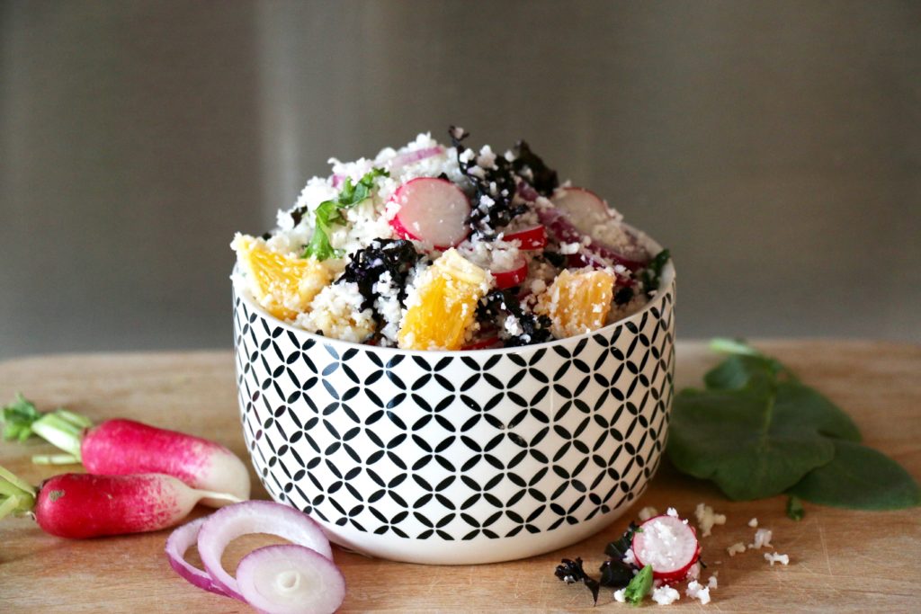 Recipe by Passion nutrition at https://www.passionnutrition.com/taboule-de-chou-fleur-chou-kale-orange/