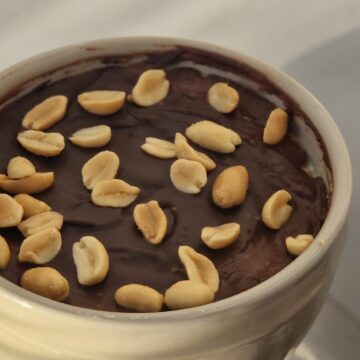 - Ajouter ensuite 15 g de chocolat noir 70% fondu et quelques cacahouètes concassées.