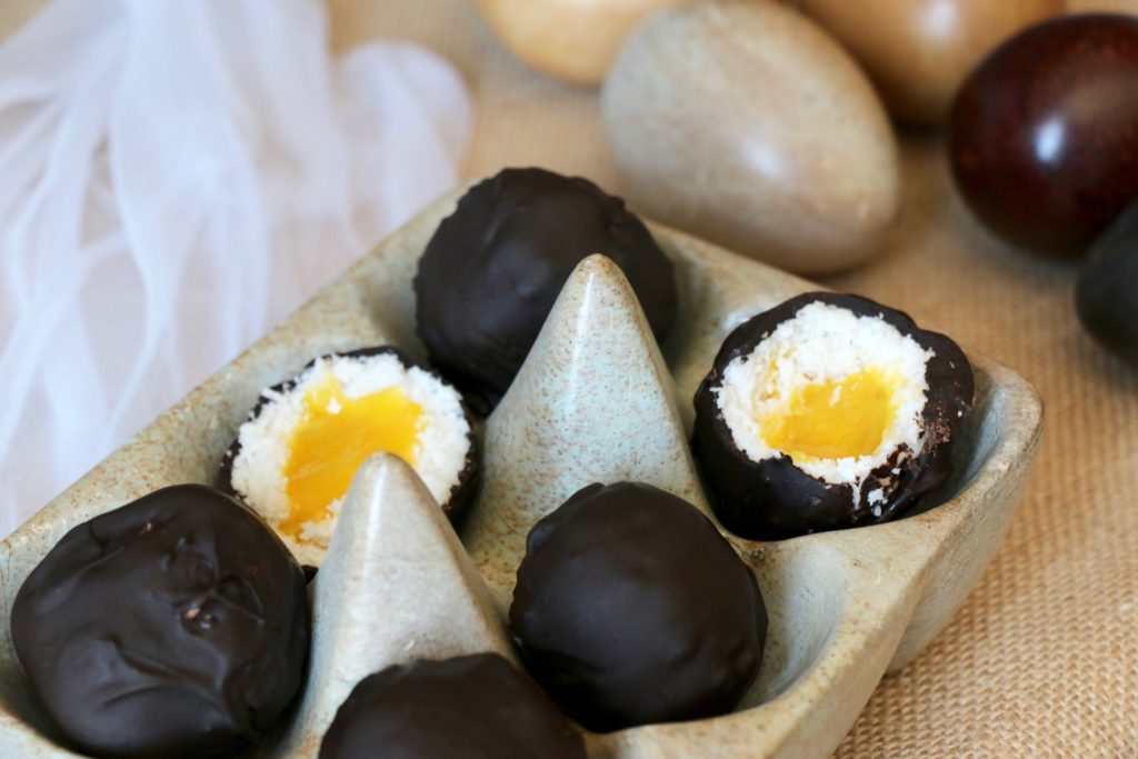 Dès que le chocolat est suffisamment dur, décollez les boules délicatement avec la pointe d’un couteau, disposez-les sur une autre assiette et entreposez au réfrigérateur pendant 1 à 2 heures (ou davantage) : La mangue va fondre et vous pourrez consommer vos œufs de Pâques « coque ».